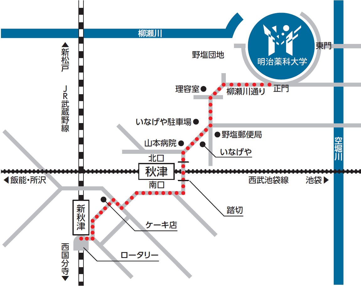 秋津駅南口は、JR武蔵野線新秋津駅の乗換口となり、改札口左側に交番があります。改札口を出て、左に曲がり、線路沿いの道を150mほど進み、踏切を渡ってください。スーパーマーケット(いなげや秋津駅前店)の前を通り過ぎ、「柳瀬川通り」を道なりに進んでください。 - 秋津駅北口(所沢方面から来られた方)