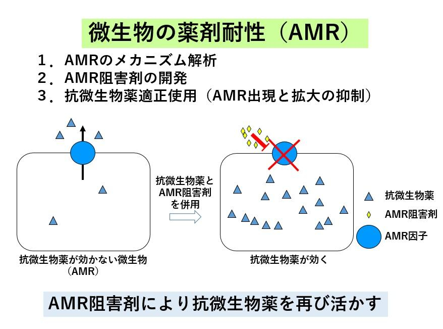 AMR阻害剤開発の一例です。この微生物はAMR因子の働きにより薬が効きません。AMR阻害剤によりAMR因子 の働きを悪くすることで、使用できなくなった抗微生物薬を再び蘇らすことができます。