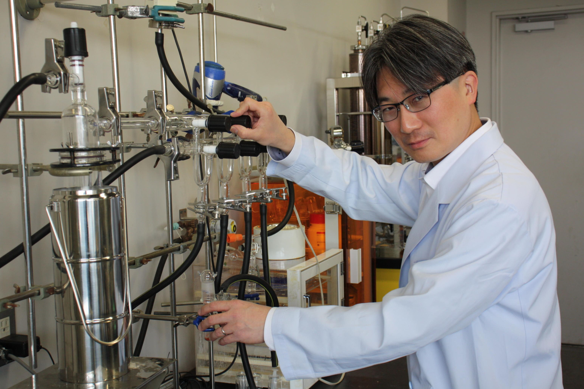 遷移金属触媒は空気や水に不安定なものが多いので、特殊な装置を使って実験を行います。