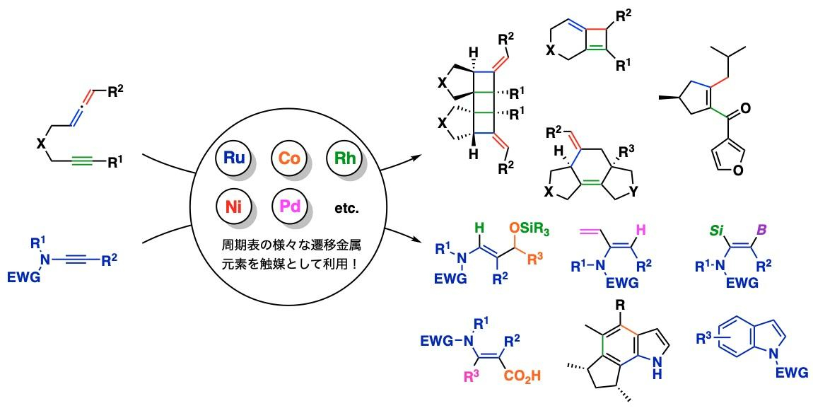私たちが風邪を引いたり、お腹が痛くなったりしたときにまず口にするくすりの大部分は炭素原子が連なって作られる「有機化合物」からできています。したがって、その炭素原子を効率良く繋げられる方法(化学反応)が開発できれば、くすりの迅速な供給へと貢献つながることが期待されます。私たちの研究グループではそれを実現するために、遷移金属化合物を『触媒』として利用して、炭素原子を繋ぐ新しい化学反応の開発研究を進めています。