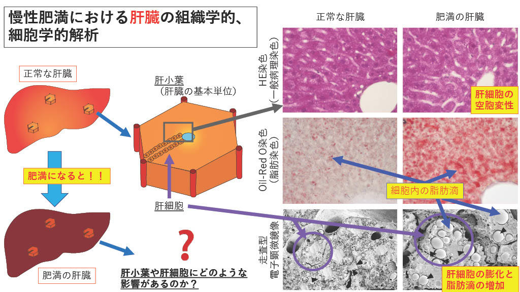 一例ですが、近年世界中で健康被害として認識されている病気に慢性肥満があります(下図)。慢性肥満は、糖尿病や高血圧といった様々な病気につながるため早期の治療が望まれています。私たちは、慢性肥満時の肝臓の細胞(肝細胞)を観察することで、細胞内の微細な異常を明らかにすることができました。