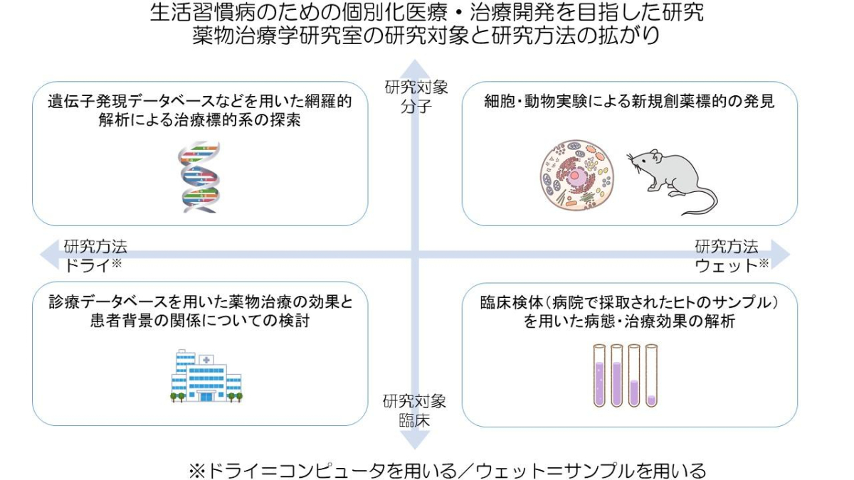 一方で、生活習慣に着目するあまり、個人の持つ遺伝子や環境によって生活習慣病のなりやすさが大きく違うにも関わらず、「生活習慣病になるのはだらしない」といった偏見や無用な差別も生まれています。そこで、生活習慣病を正しく理解し、少しでも効果的な治療を実現し、全世界で生活習慣病を克服し、皆が平等に生活を楽しみ、やりがいに力を注げるよう、薬物治療学研究室では生活習慣病についての正しい教育・啓発活動、新しい負担の少ない薬の開発や、個人の性質にあった薬の使い方を目指して、実験による研究や、病院のデータを使った研究を行っています。