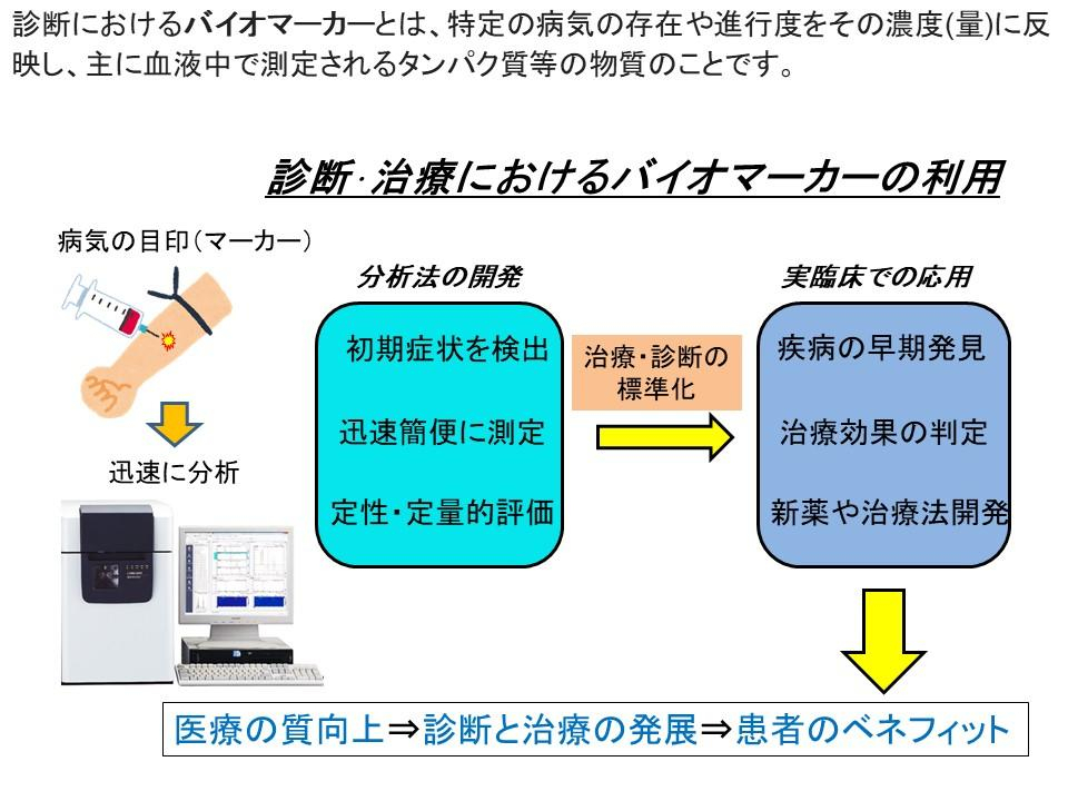 新たなバイオマーカーの探索と、その分析法の開発により疾病の早期発見・診断・治療介入の促進に貢献する