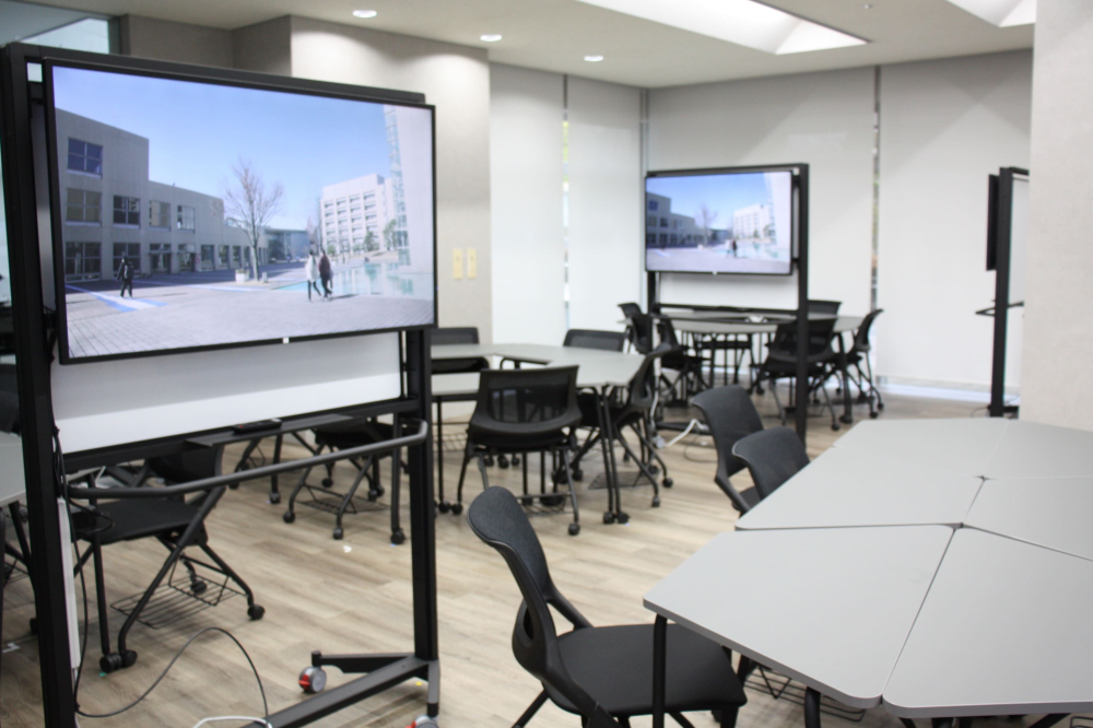 この教室は、ゼミなどで資料を広げて使用できるよう机を備えたアクティブラーニング教室として整備しました。台形の机と椅子を用いて円形や長方形の島を形成し、12グループ(1グループ6名)での学習が可能です。各グループには液晶ディスプレイとホワイトボードを配置し、協働的な学びを支援しています。また、アクティブラーニング教室1とMicrosoft Teamsを通じて連携することで、最大144名までの同時授業に対応できます。定期試験期間中は、机の配置を変更して自習室としても活用しています。