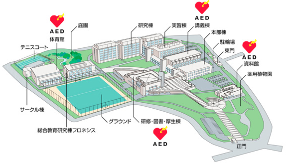 本学では、救急車到着までの救命措置として、教職員や学生が多く利用する場所にAEDを設置しています。