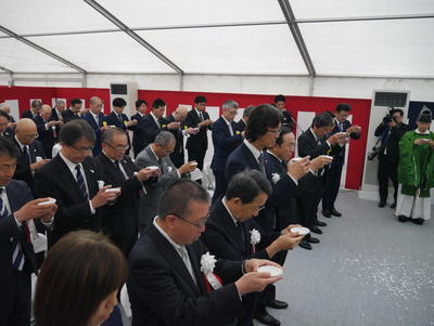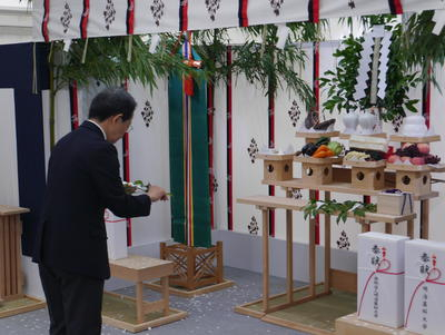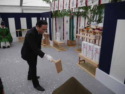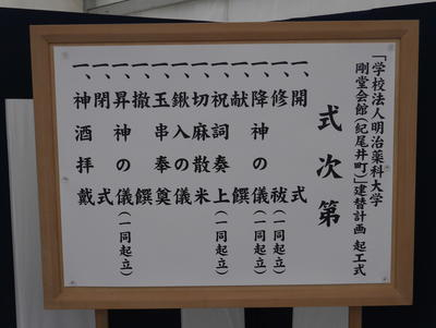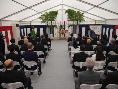 式には、佐川賢一理事長、越前宏俊学長をはじめ理事・顧問と大学関係者及び工事関係者のご列席のもと、工事が安全に遅滞なく進めることができるよう、日枝神社神職によりご祈祷いただきました。