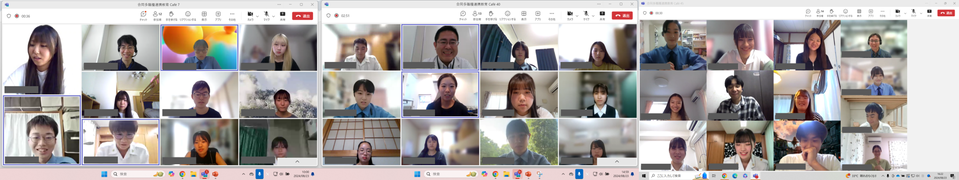 学生は、グループ毎に指定された時間に、指定されたcaféにオンラインで入室し、担当評価者の司会の下で、1時間にわたって自由に懇談しました。特にテーマを設けないことで、普段の生活や学修環境を始め、将来の夢といったことについてもフランクに話し合うことができ、他学科の学生を理解する良い機会となったのではないでしょうか。