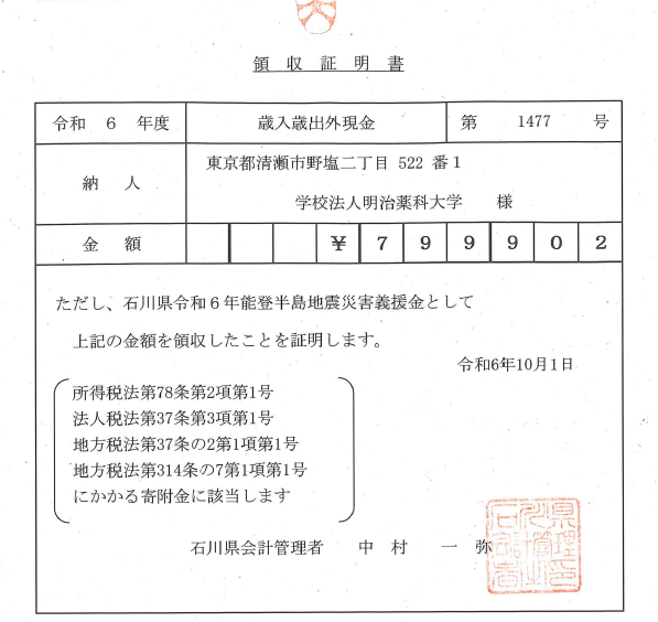 令和6年能登半島地震により被災された方々に心からお見舞い申し上げます。 学校法人明治薬科大学は、令和6年能登半島地震の被災地の復旧及び復興支援のため、皆様からお寄せいただいた義援金を石川県の災害義援金口座へ寄付しました。