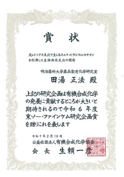 田湯正法講師(薬品製造化学研究室)が、2024年有機合成化学協会研究企画賞「東ソー・ファインケム研究企画賞」を受賞しました