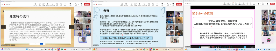 グループ別セッションでは、学生はファシリテータの指示する順番で、課題の発表者と司会者を1回ずつ担当しました。課題は、各自が事前に医療事故の事例について5分以上6分以内で発表できるようにMicrosoft PowerPointによる資料を用意するもので、発表者は、画面共有機能を使用して、この資料をプレゼンテーションいたしました。発表後には、司会者を中心に全員が参加して、6分以内で、提示された医療事故事例について討論を行いました。このセッションでは、Microsoft PowerPointを用いた資料作成能力、双方向授業システムを使いこなして効果的なプレゼンテーションを行う能力、オンラインで相手に確実に物事を伝達する能力およびリーダーシップが要求され、まさにオンラインでのコミュニケーション能力を涵養する場となりました。