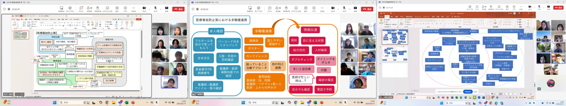 続いて学生は、KJ法を参考にした手法で医療事故防止策を提案する、1時間のグループワークを実施いたしました。リーダー、書記、発表者の役割決めも、学生自らが工夫して行いました。リーダーの司会のもと、各学生は医療事故防止につながることを自由に挙げていき、書記が画面共有したMicrosoft PowerPoint上に書き込みました。挙げられた各項目をグループ化した上で、グループ間の関係性を考察し、最終的には、発表者が、グループとして提案する医療事故防止策をファシリテータにプレゼンテーションいたしました。オンラインでのこの課題実施は決して簡単なものではありませんが、どのグループも、実際に医療事故防止策を提案することができており、仲間と協力することで課題を達成することができた経験は、きっと将来の多職種連携に役立つことでしょう。遠隔実施の欠点として、実習の前後に学生同士が自由に話して交流できないことが挙げられますが、本合同IPEでは、グループワーク終了後に、学生のみで15分間のフリートークを行う機会を設けております。