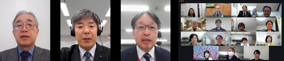 学生は、各学科の学生から構成される、あらかじめ指定された午前20グループ、午後21グループ(各グループ7~8名)に分かれ、各グループを1名のファシリテータが担当いたしました。午前、午後ともに、全体セッション後にグループ別セッションを実施し、再び全体セッションに戻る形式であり、最初の全体セッションでは、両大学の代表者がライブで挨拶を行いました。続いて当日の流れの説明があり、その後、アイスブレイキングの一環として、すべてのファシリテータを紹介するビデオが上映されました。