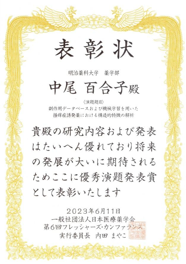 2023(令和5)年6月11日に開催されました日本医療薬学会第6回フレッシャーズ・カンファランス(京都)において、薬学科5年生の河邉綾乃さんと薬学科6年生の中尾百合子さん(ともに医療分子解析学研究室)が優秀演題発表賞を受賞しました。