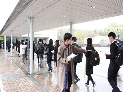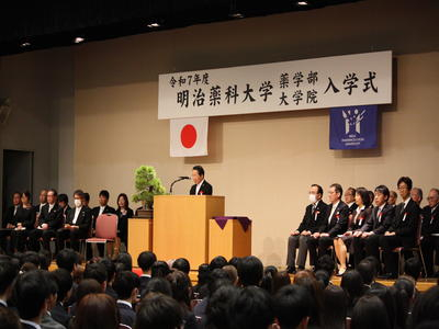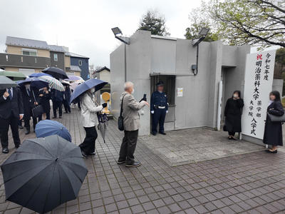 2025年(令和7年)4月3日(木)、本学清瀬キャンパス多目的大講義室にて入学式を挙行しました。当日は雨模様でしたが、新入生とその保護者、来賓の方々が多数参加し、盛大に執り行われました。学長の式辞、理事長および来賓からの祝辞、新入生からの誓いの言葉がありました。入学式の様子は総合教育研究棟フロネシスの大講義室と講義室、更に新入生の保護者の方々にYouTubeで同時中継されました。入学式開式前には、雨にも関わらず正門横の入学式看板前で記念写真を撮る多数の新入生と保護者の姿が見られました。