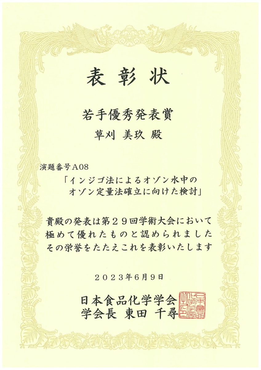 2023(令和5)年6月8~9日に開催されました日本食品化学学会 第29回総会・学術大会(会場:富山県富山市)において、薬学科6年生の草刈美玖さん(環境衛生学研究室:健康薬学コース、実習施設:国立医薬品食品衛生研究所・食品添加物部)が若手優秀発表賞を受賞しました。