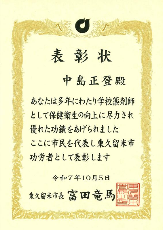 このたび、明治薬科大学附属薬局の中島正登管理薬剤師が、東久留米市より保健衛生功労表彰を受けました。本表彰は、附属薬局の開局当初より学校薬剤師として保健衛生の向上に尽力してきた功績が評価されたものです。