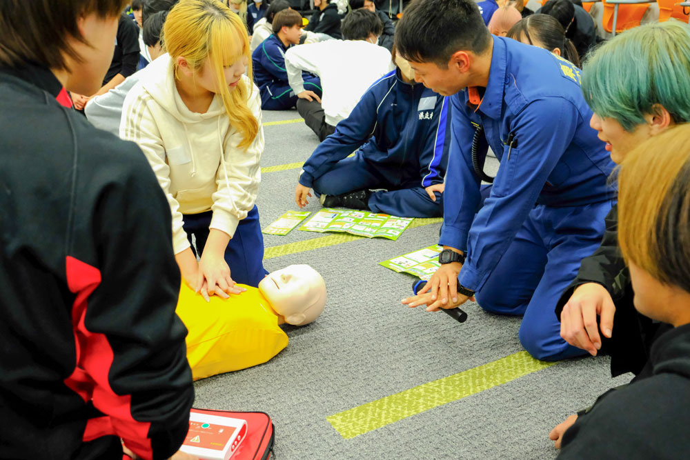 本学では、生命創薬科学科1年生の授業「健康運動演習」(担当:今野 亮講師)の一環として、救急救命講習を実施しています。