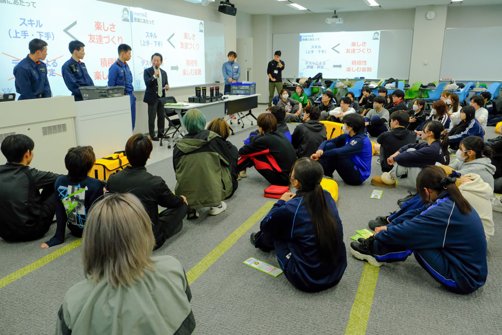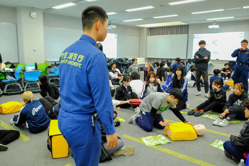 今年度は、地元・清瀬消防署の救急係の方々を講師にお招きし、講義と実技指導をいただきました。学生たちは、心肺蘇生法やAED(自動体外式除細動器)の使用方法など、具体的な救命技術を学習しました。こうした実践的な機会を通じて、学生たちは救急救命の重要性を身をもって学ぶことができました。