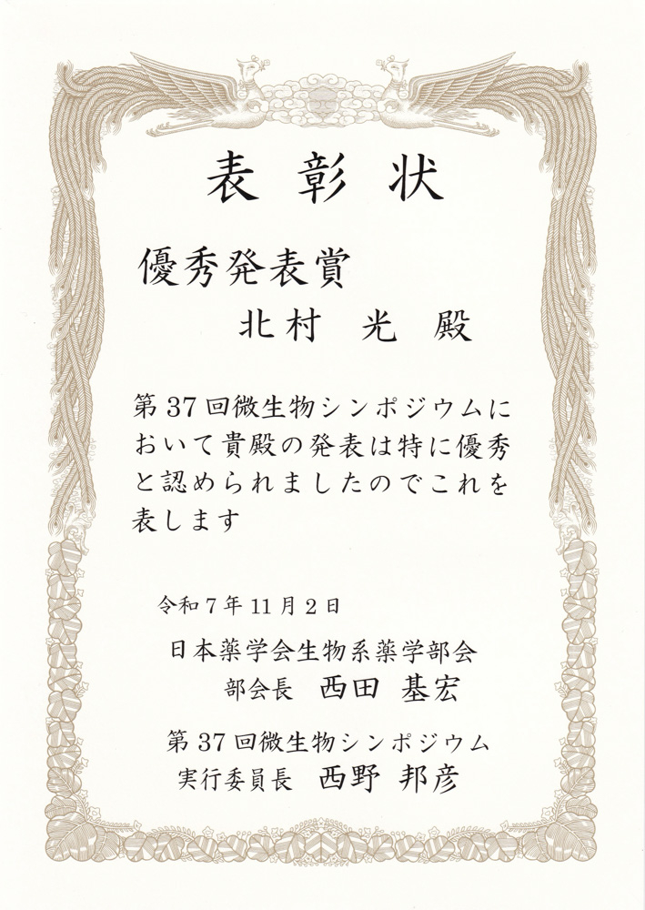 2025年(令和7年)11月1日(土)~2日(日)に開催された第37回微生物シンポジウム(主催:日本薬学会 生物系薬学部会)において、生命創薬科学専攻博士課程(前期)1年の北村 光さん(感染制御学研究室)が「優秀発表賞」を受賞しました。