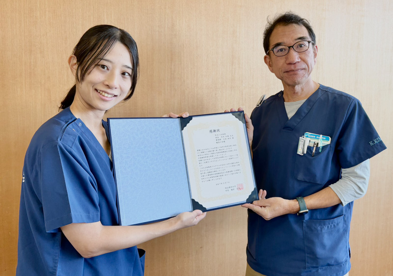 感謝状を持つ大屋薬剤師(左)と木村院長(右)