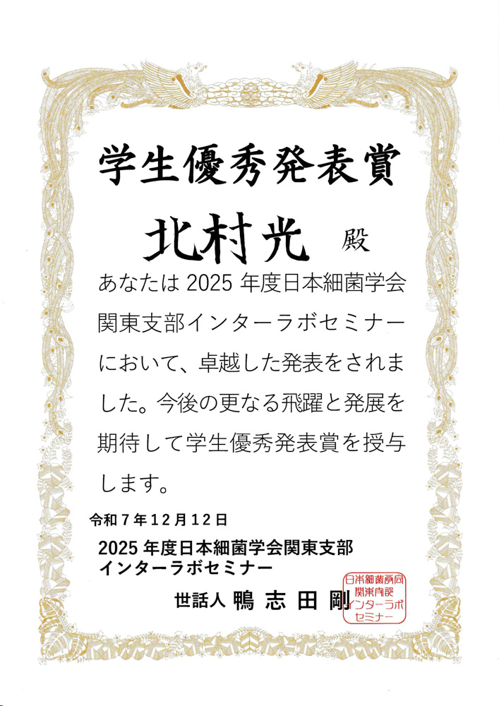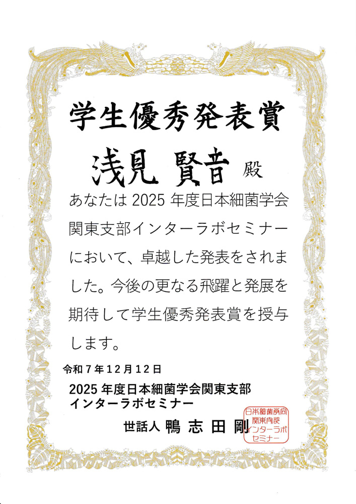 本学学生3名が2025年度⽇本細菌学会関東⽀部インターラボセミナーで「優秀発表賞」を受賞しました