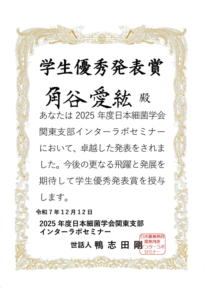 2025年(令和7年)12月12日(金)に開催された2025年度日本細菌学会関東支部インターラボセミナーにおいて、感染制御学研究室所属の学生3名が「学生優秀発表賞」を受賞しました。