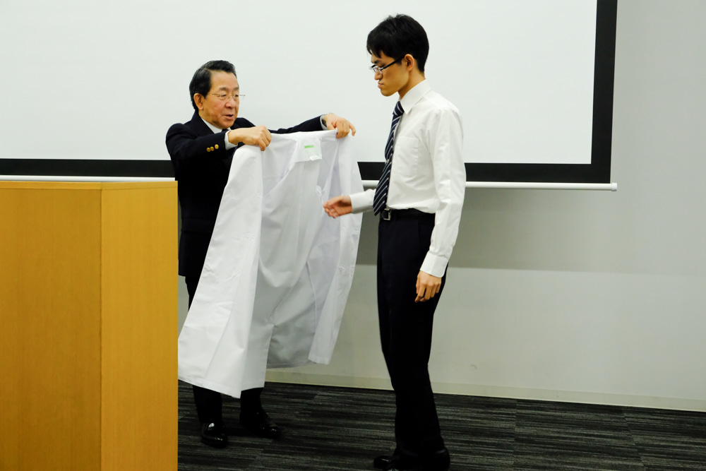 学長から代表者へ白衣授与
