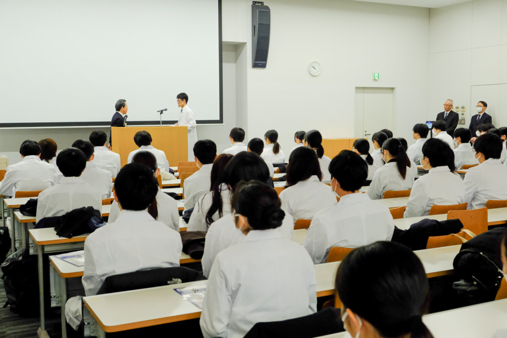 実際の医療現場(薬局および病院)での実務実習を前に、学生たちは真新しい白衣を手にし、薬剤師を目指す者としての自覚を深める機会となりました。