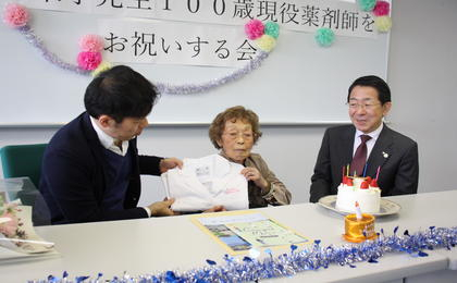 令和5年11月6日に100歳の誕生日を迎え、現在も現役の薬剤師として活躍している本学の卒業生、比留間栄子さん(昭和19年卒業)を本学にお招きし、お誕生日のお祝いを行いました。その様子が令和6年1月13日(土)13時30分からテレビ朝日系列(テレビ朝日・ABCテレビ・静岡朝日テレビのみ)の「100歳に聞く!~人生最高の瞬間~傑作選」で放送されました。