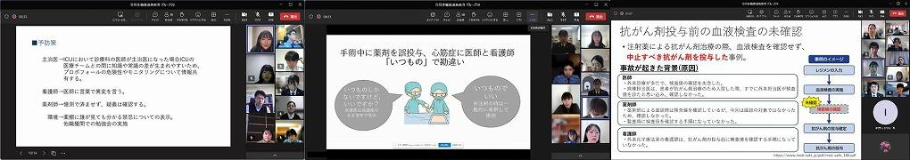 グループ別セッションでは、学生はファシリテータの指名により、課題の発表者と司会者を1回ずつ経験しました。課題は、各自が事前に、医療事故の事例について5分以上6分以内で発表できるようにMicrosoft PowerPoint®による資料を用意するもので、発表者は、画面共有機能を使用して、この資料をプレゼンテーションし、課題の発表後には、司会者を中心に全員が参加して、6分以内で、提示された医療事故事例について議論を行いました。このセッションでは、Microsoft PowerPoint®を用いた資料作成能力、双方向授業システムを使いこなして効果的なプレゼンテーションを行う能力、オンラインで相手に確実に物事を伝達する能力およびリーダーシップの発揮が要求され、まさにオンラインでのコミュニケーション能力を涵養する機会となりました。