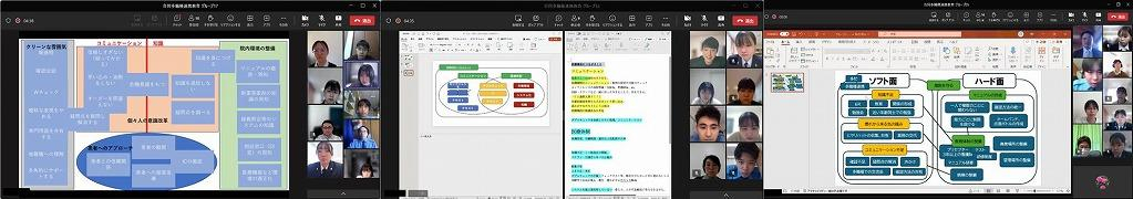 続いて学生は、KJ法を参考にした手法で医療事故防止策を提案するグループワークを実施いたしました。リーダー、書記、発表者という役割決めにも、オンラインならではのコミュニケーション能力が求められますが、それぞれのグループで工夫して実施できたようです。次いで、リーダーの司会のもと、各学生は医療事故防止につながることを挙げていき、書記が画面共有したMicrosoft PowerPoint®上に書き込みました。挙げられた各項目をグループ化した上で、グループ間の関係性を考察し、最終的には、発表者が、グループとして提案する医療事故防止策をファシリテータにプレゼンテーションいたしました。オンラインでのこの課題実施は、決して簡単なものではありませんが、どのグループも、例外なく実際に医療事故防止策を提案することができており、仲間と協力することで課題を達成することができた経験は、きっと将来の多職種連携に役立つことでしょう。グループワーク終了後は、学生のみが自分のグループに残って15分間のフリートークを実施し、さらに交流を深めました。