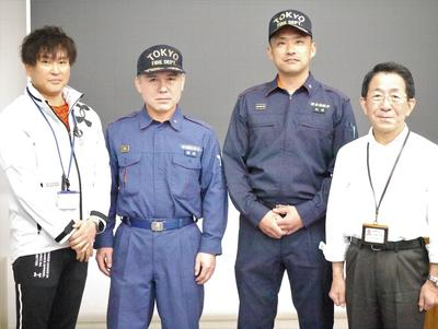 左から、今野亮講師、清瀬消防署員、越前宏俊学長