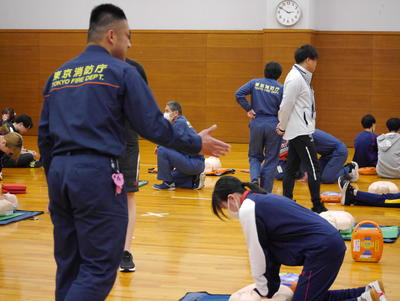 本学は、新1年生の授業(健康運動演習:今野 亮講師担当)の一環として、救急救命の授業を実施しています。今年度は、地元清瀬消防署の救急係の方々を講師としてお招きし、救急救命についての講義と実技の指導を受けました。学生たちは、心肺蘇生やAED(自動体外式除細動器)の使用方法など、具体的な救命技術を学びました。このような実践的な学びを通じて、学生たちは救急救命の重要性を身をもって理解することができました。